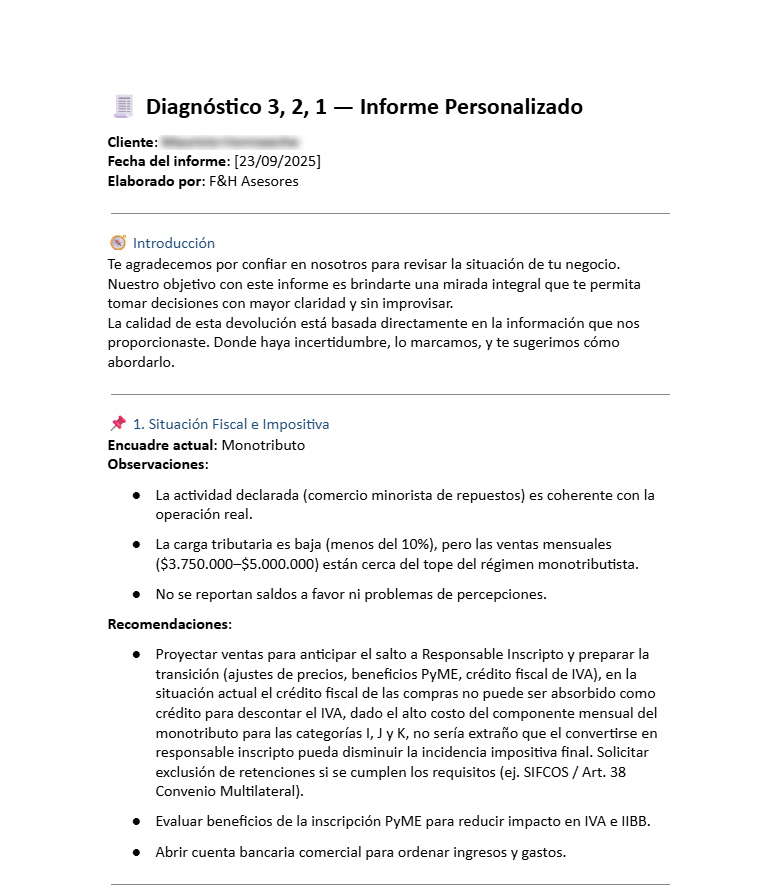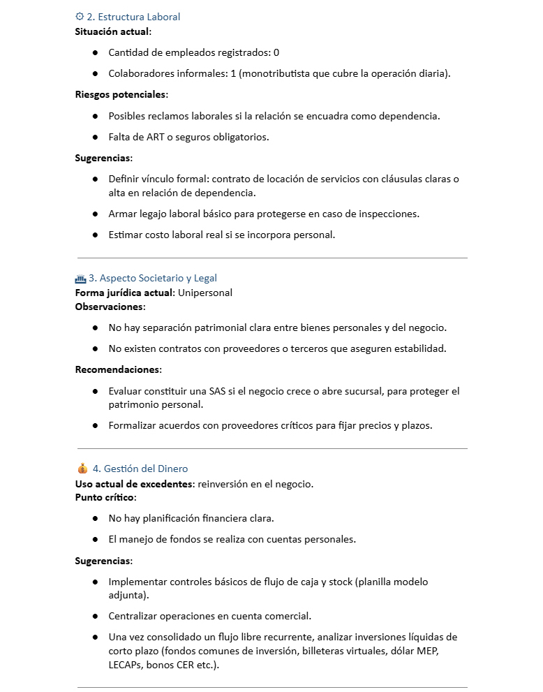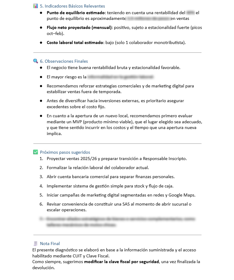 Un análisis integral de tu negocio Al finalizar el proceso, recibirás un informe claro y preciso. Esto te permitirá comprender el estado actual de tu emprendimiento y tomar decisiones estratégicas con mayor seguridad. Con esta información en tus manos, podrás evaluar tu situación fiscal, laboral y financiera, identificar oportunidades de mejora y definir los próximos pasos para optimizar la gestión de tu negocio.